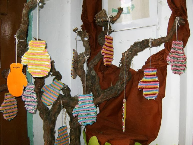 Depois de fazermos o padrão com lã , colámos e recortámos as luvas em cartão e depois pintámos.